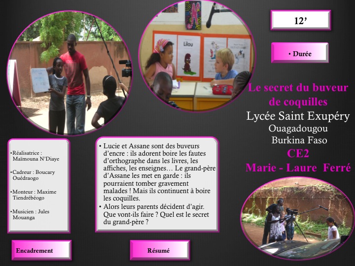 Onze courts métrages ont été réalisés par des élèves d’établissements scolaires français de la zone Afrique Occidentale tout au long de l’année scolaire 2010-2011. Chaque classe engagée dans le projet, après avoir travaillé sur la lecture d’une œuvre de la littérature jeunesse, a élaboré un scénario, tourné et monté un film, avec l’appui de professionnels ouest-africains du cinéma.